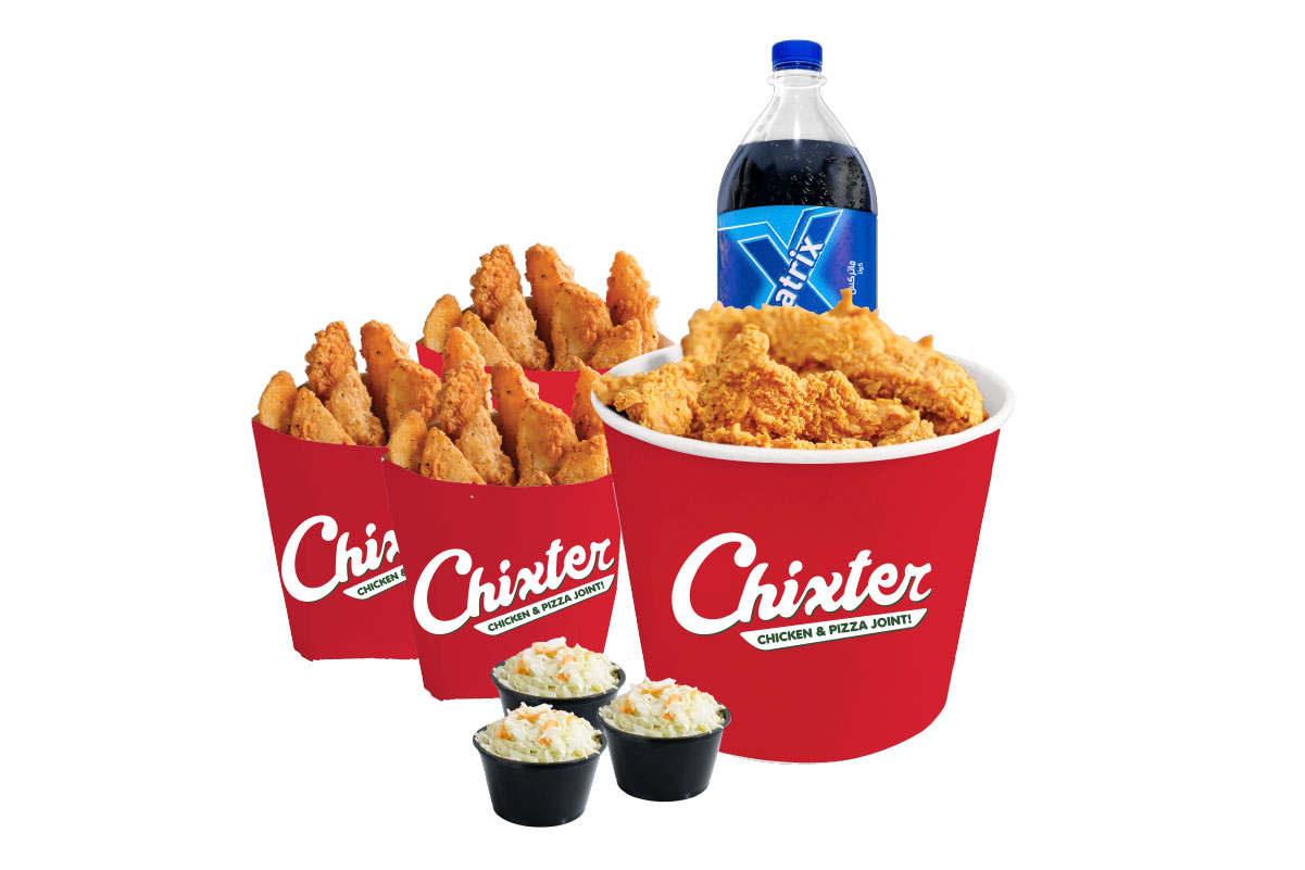 15 Crispy Chicken Strips, your choice of fries ,your choice of Liter, 3 coleslaws, and your choice of 4 sauces.