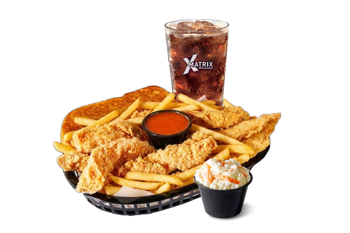 5 Chicken Strips, coleslaw, 2 sauces and garlic bread. Served with choice of fries and choice of drink .