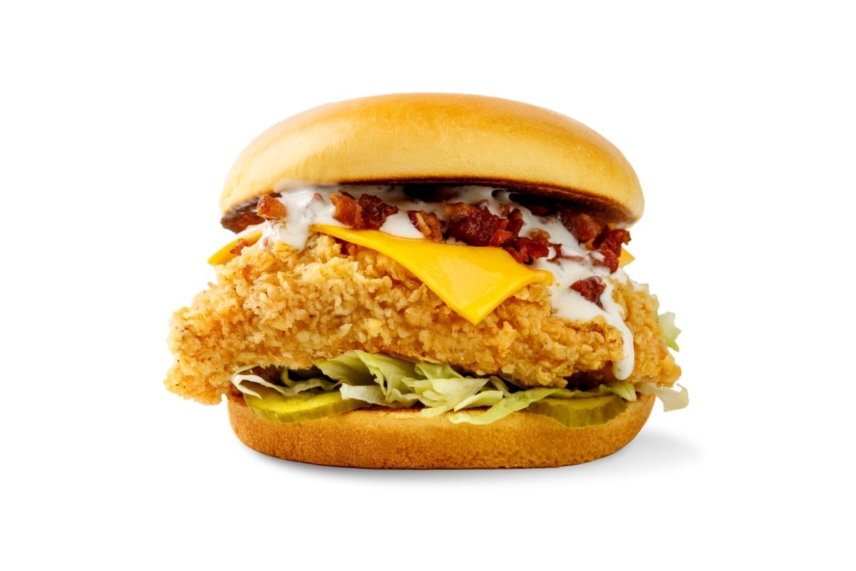 Crispy chicken fillet topped with crispy beef bacon, cheese, lettuce, tomatoes, pickles, and ranch.