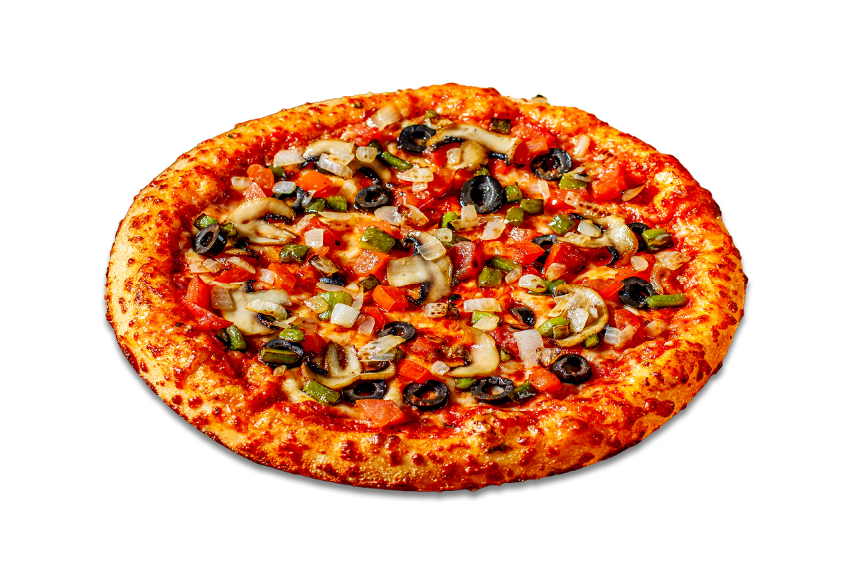 Pizza Sauce, Mozzarella Cheese, Green Peppers, Mushrooms, Tomatoes, Black Olives, Diced Onions & Parmesan Cheese.